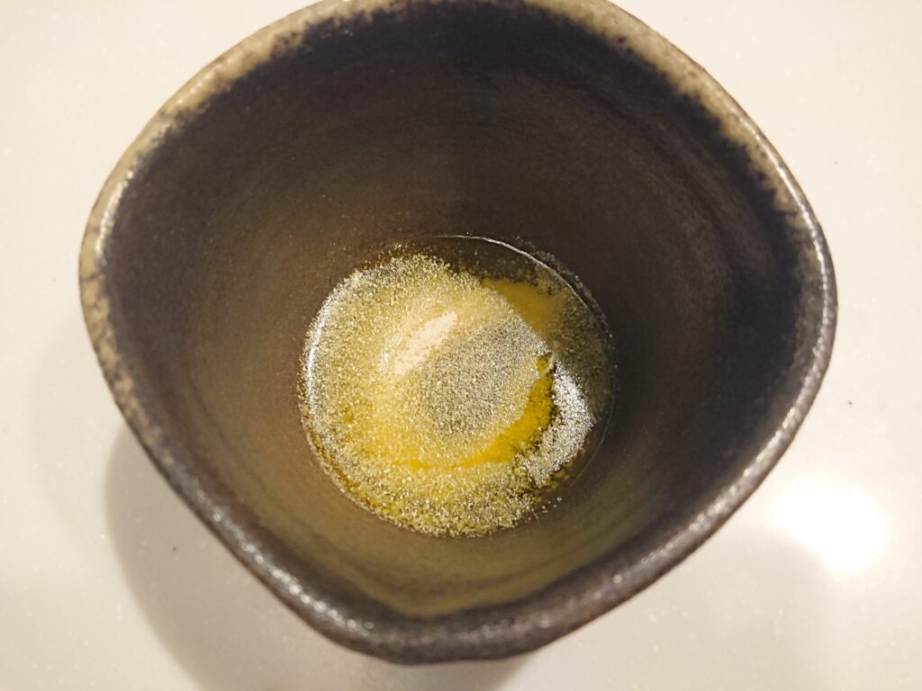 けっこうな痛みになってきたので新たなスープを、いつも油物を食べると痛みが治まるのでオリーブオイル、修復にボーンブロス、サッパリさせるのにお酢を入れお湯で溶きました。
