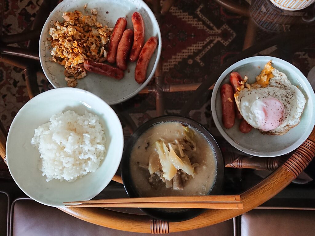 昨夜のタコ味噌汁、白米、ソーセージ、炒り卵です。