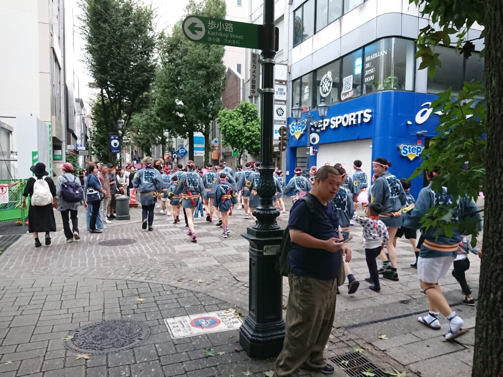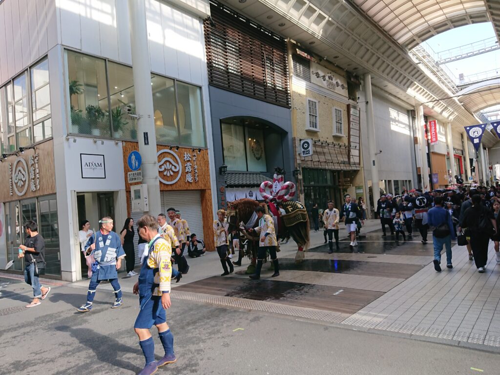 神社から中心部の商店街へ、見物客と出場者の数が同じくらい、各組200人×59組という感じです。