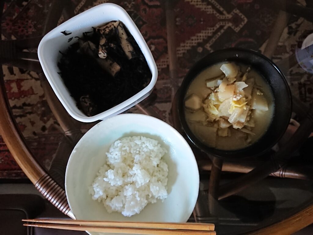 昨夜の残り物、味噌汁と白米、ひじきです。