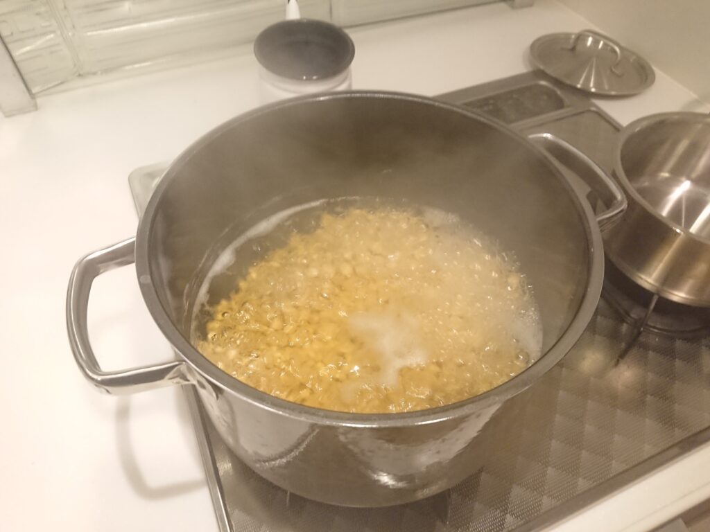 スパイスカレー作り開始、昨日から水に浸しておいたひよこ豆を90分煮ます。
