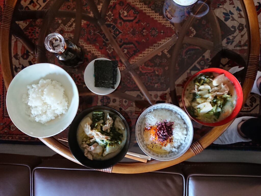 豚汁と白米、海苔ですが僕も卵かけご飯にしてみました。