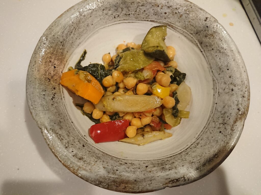 塩コショウ、水分が嫌なので強火で飛ばし煮たひよこ豆を投入、生トマト、バルサミコ酢でミネステローネにしました。